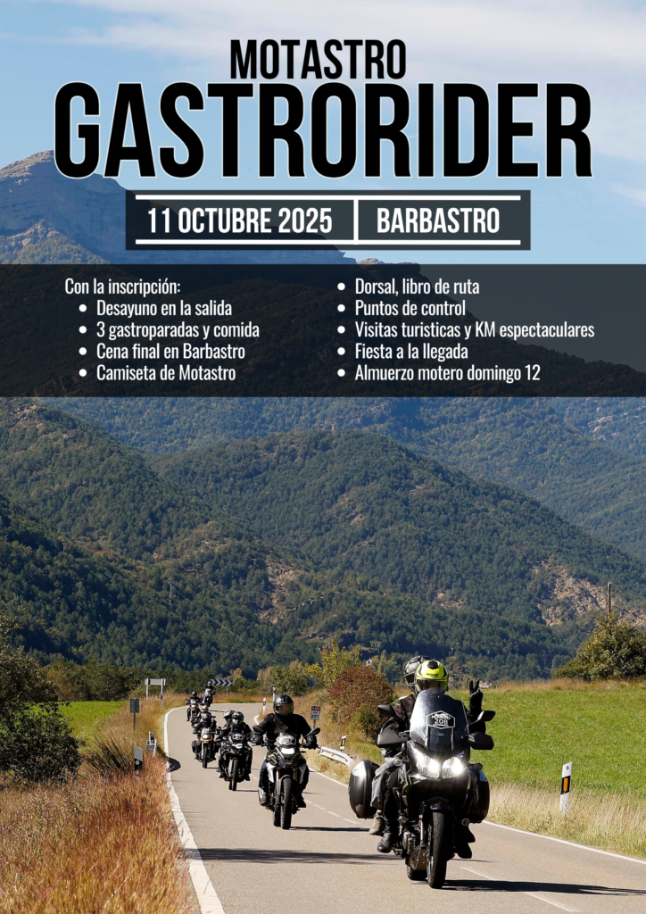Motastro Gastrorider es una ruta mototurística de aproximadamente 320 km que recorre las carreteras más pintorescas del Pirineo y Prepirineo de Huesca. A lo largo del recorrido, los participantes disfrutarán de paradas gastronómicas donde podrán degustar productos locales y realizar visitas turísticas opcionales a espacios singulares. El evento no es competitivo; el objetivo es disfrutar del paisaje, la gastronomía y la compañía de otros moteros.