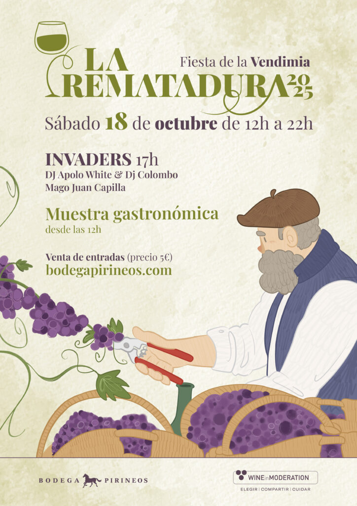 La Fiesta de la Vendimia «La Rematadura», organizada por Bodega Pirineos en Barbastro, Huesca, se celebrará el sábado 18 de octubre de 2025, de 12:00 a 22:00 h. Esta celebración se ha convertido en una de las citas más esperadas del calendario vinícola de Aragón, uniendo tradición, gastronomía, música y cultura en un entorno único que rinde homenaje a la labor de los viticultores de la región del Somontano.