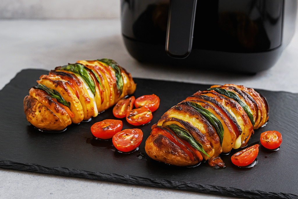 - Cocina a 190 °C durante 25–30 minutos, hasta que la patata esté tierna y el queso gratinado.