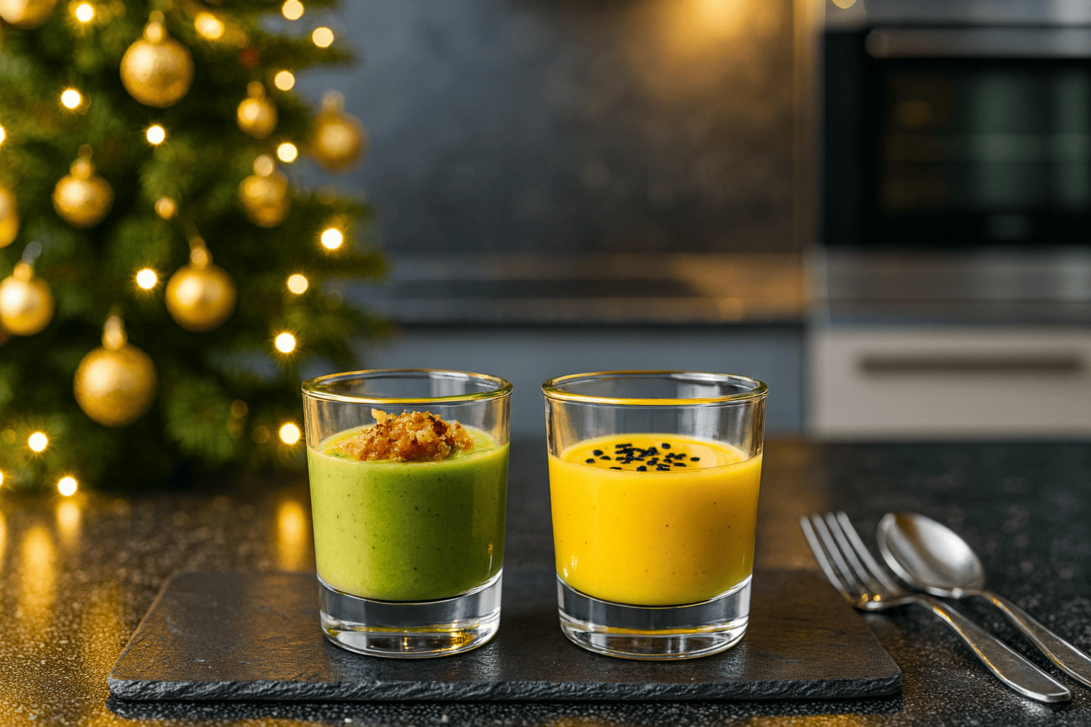 Entrantes navideños en chupito: Crema de guisantes y crema de calabaza