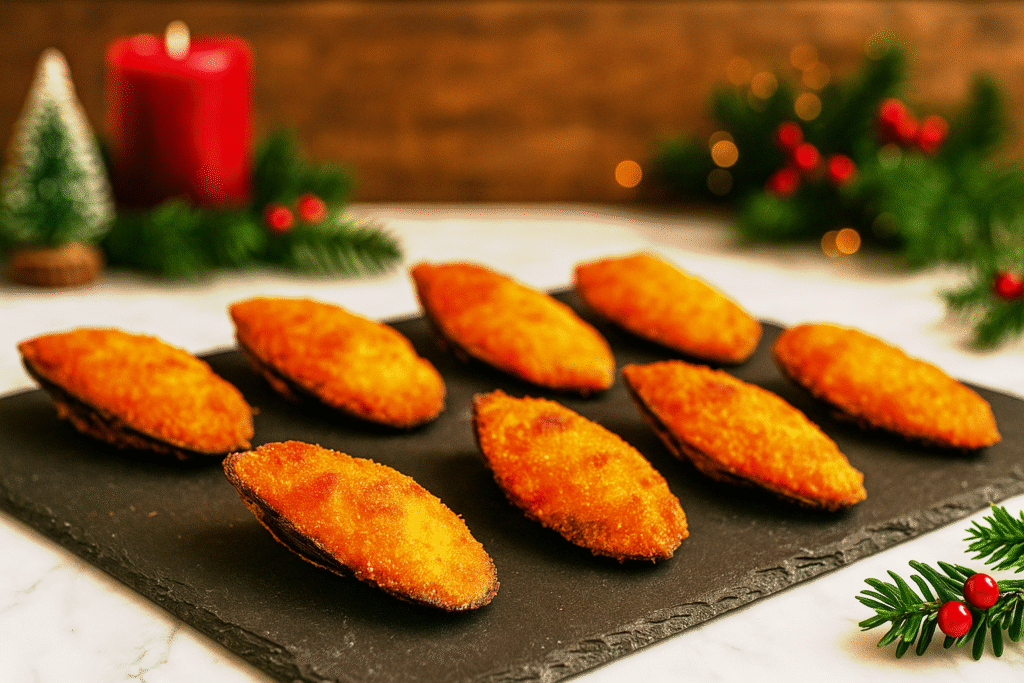 Los mejillones tigre son un clásico irresistible que no puede faltar en las mesas navideñas. Crujientes por fuera, cremosos por dentro y con todo el sabor del mar, son el entrante perfecto para sorprender a tus invitados. Esta receta combina sencillez y elegancia, ideal para preparar con antelación y disfrutar sin prisas. Atrévete a servirlos estas fiestas y verás cómo desaparecen del plato en un instante.