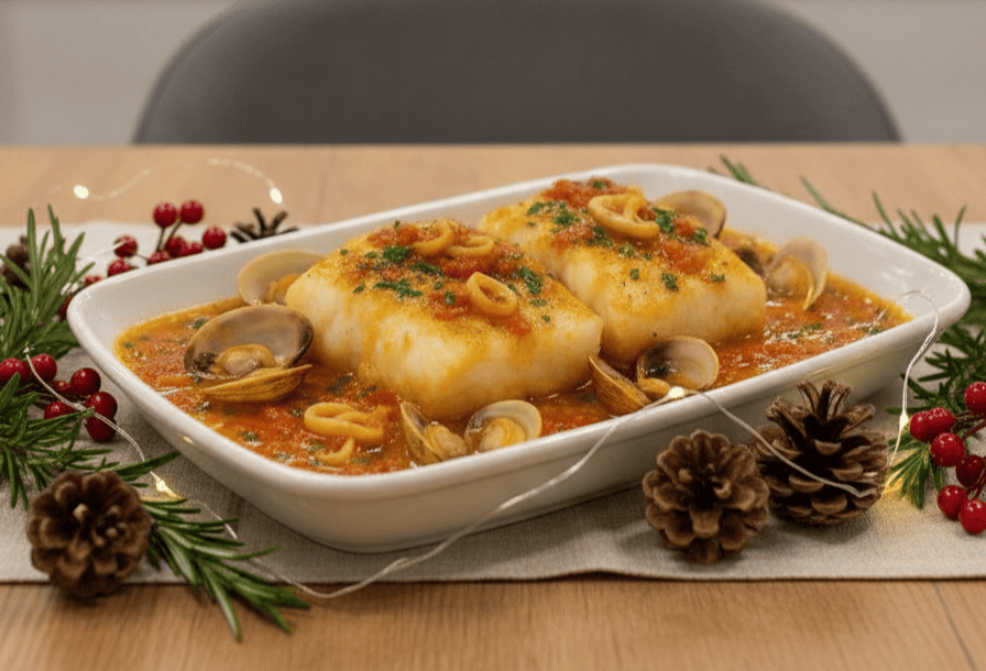 En estas fiestas, sorprende a tu mesa con un plato que huele a mar y a celebración. Estos lomos de merluza en salsa marinera, acompañados de tiernos calamares y jugosas almejas, traen el espíritu navideño en cada bocado. Es una receta elegante, cálida y perfecta para los brindis en familia. El contraste de sabores convierte este plato en protagonista de cualquier cena. Porque en Navidad, lo mejor es compartir tradición… ¡y buen sabor!
