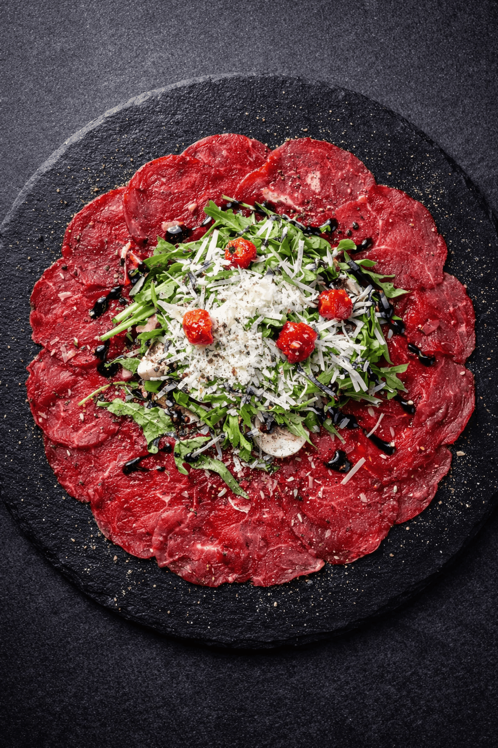 La frescura de la rúcula y el toque dulce de los tomates cherry asados equilibran cada lámina de carpaccio.