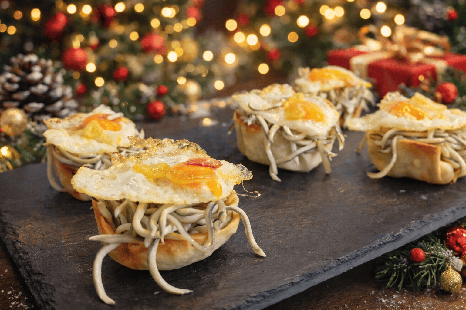 Aperitivo navideño de canastilla crujiente con anguriñas y huevo de codorniz