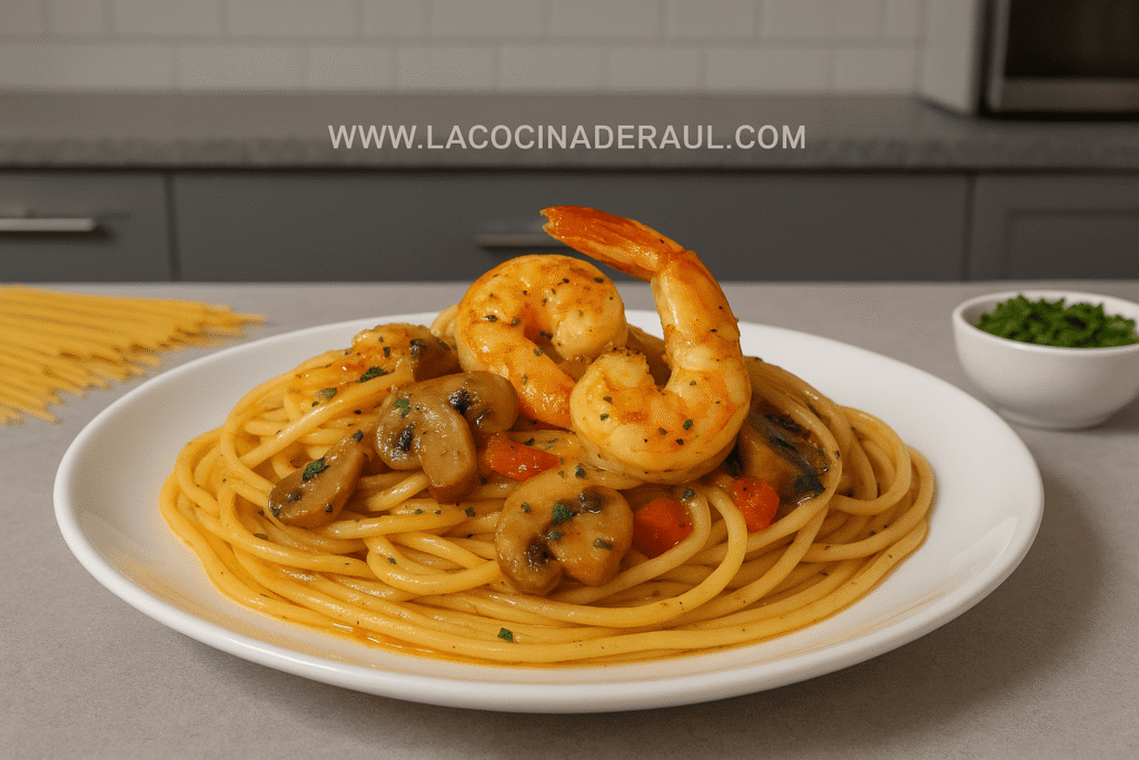 Hoy te traigo una receta rápida, cremosa y llena de sabor mediterráneo: unos espaguetis con champiñones y gambas que se preparan en menos de 20 minutos.