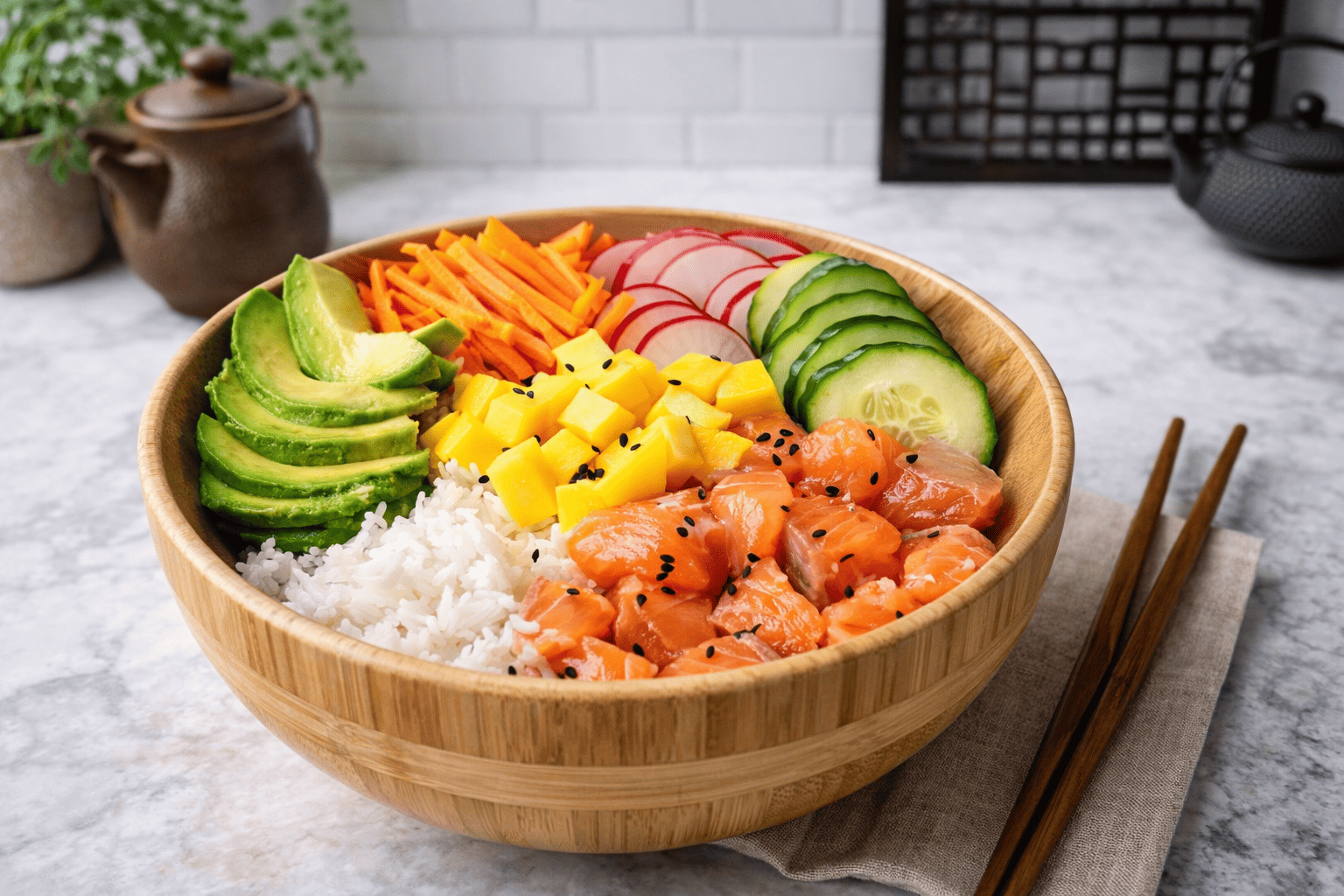 Descubre cómo preparar un poke bowl de salmón fresco con arroz blanco, mango, aguacate y verduras crujientes en solo unos minutos.